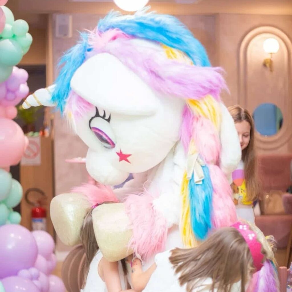 Oseba v kostumu samoroga med animacijo za otroke – čarobna popestritev rojstnodnevnih zabav in dogodkov.