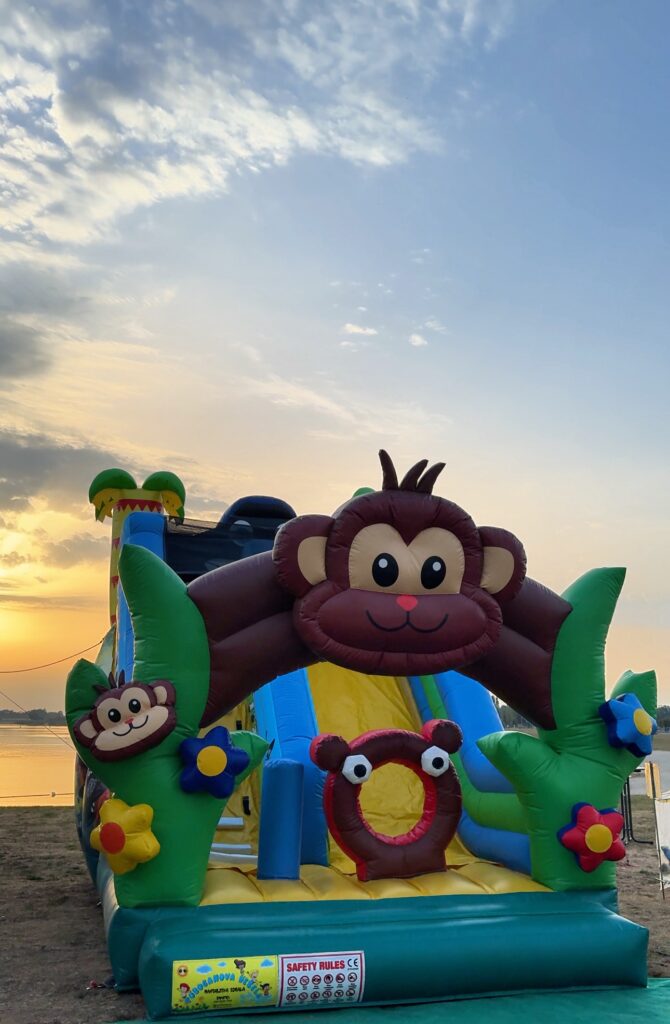 Barvito napihljivo igralo v obliki smešne opice je prava izbira za vse male navihančke, ki obožujejo plezanje, skakanje in raziskovanje. Njegova živahna džungelska tematika popestri vsak dogodek in pričara pravo mini avanturo na dvorišču ali prireditvenem prostoru.